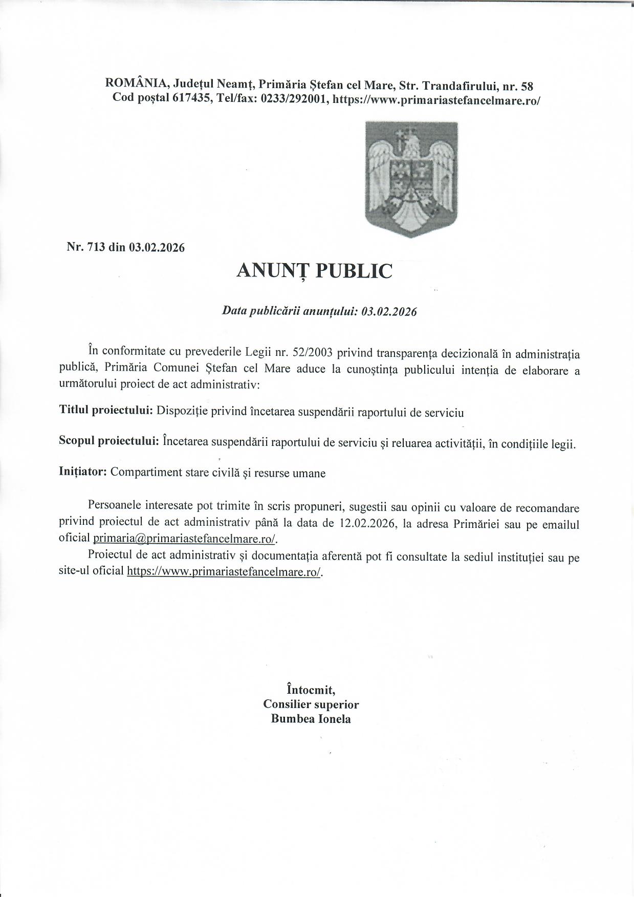 Anunt nr 713/03.02.2026 privind intenția de a elabora următorul proiect de act administrativ Dispoziție privind încetarea suspendării raportului de serviciu