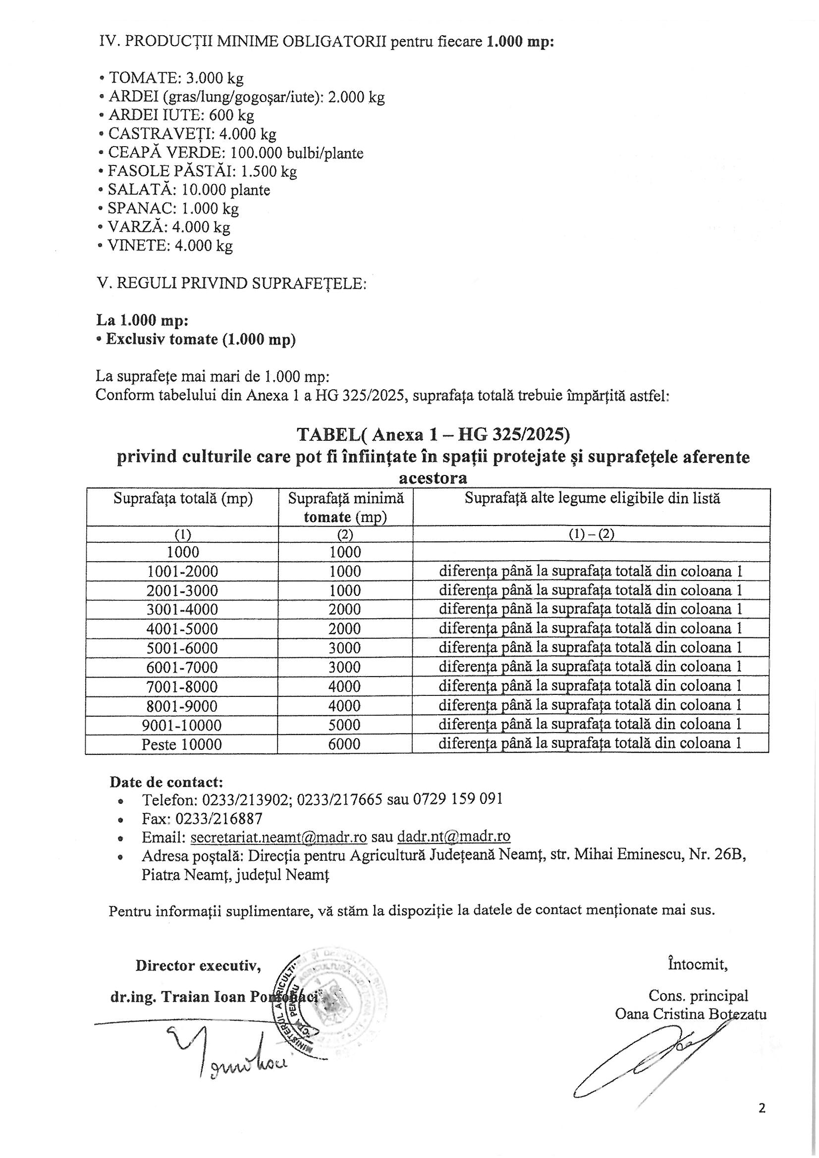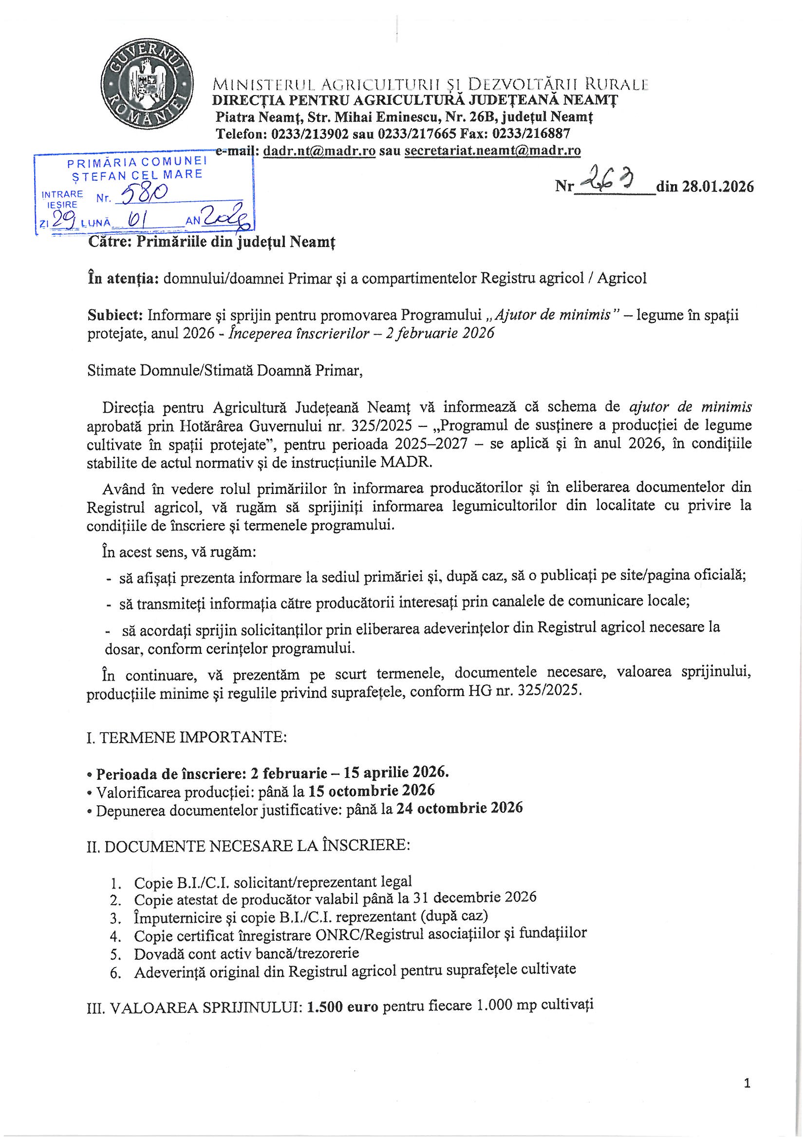 Informare şi sprijin pentru promovarea Programului,, Ajutor de minimis" - legume în spaţii protejate, anul 2026 - Începerea înscrierilor - 2 februarie 2026