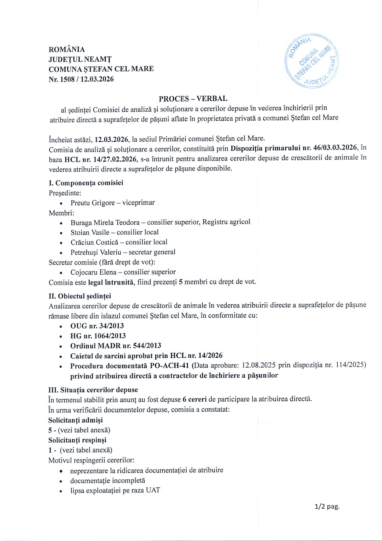 PROCES VERBAL SOLUȚIONARE CERERI INCHIRIERE PĂȘUNE
